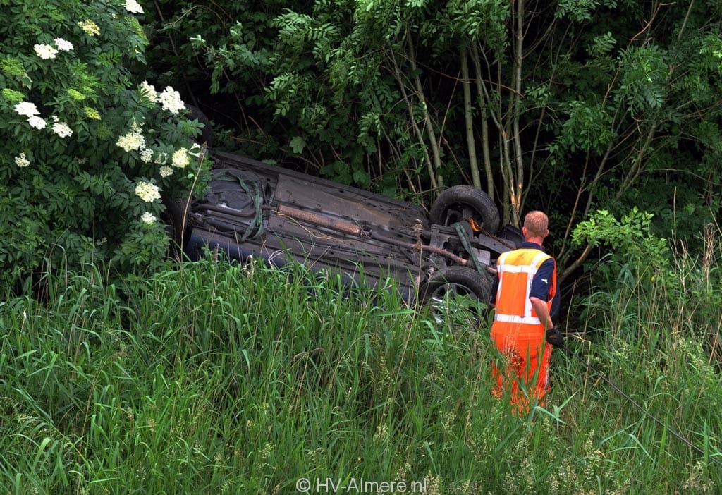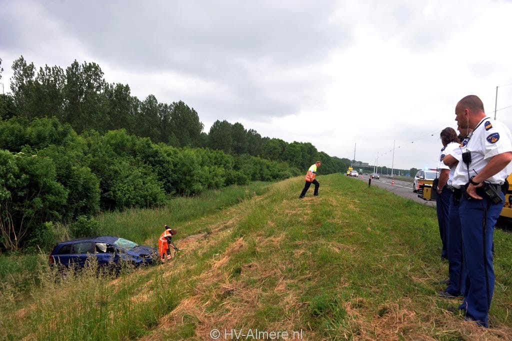 Op de snelweg A6 heeft dinsdagochtend een eenzijdig ongeval plaatsgevonden waarbij een personenauto was betrokken. Rond 10.15 raakte de auto vlak voor de afslag Almere-Stad-Oost door een nog onbekende oorzaak van de weg waarna het over de kop vloog en uiteindelijk onderaan het talud tot stilstand kwam. De twee inzittende van de auto raakten gewond. Eén van de twee personen is naar het Flevoziekenhuis overgebracht. Een berger heeft de auto afgevoerd.