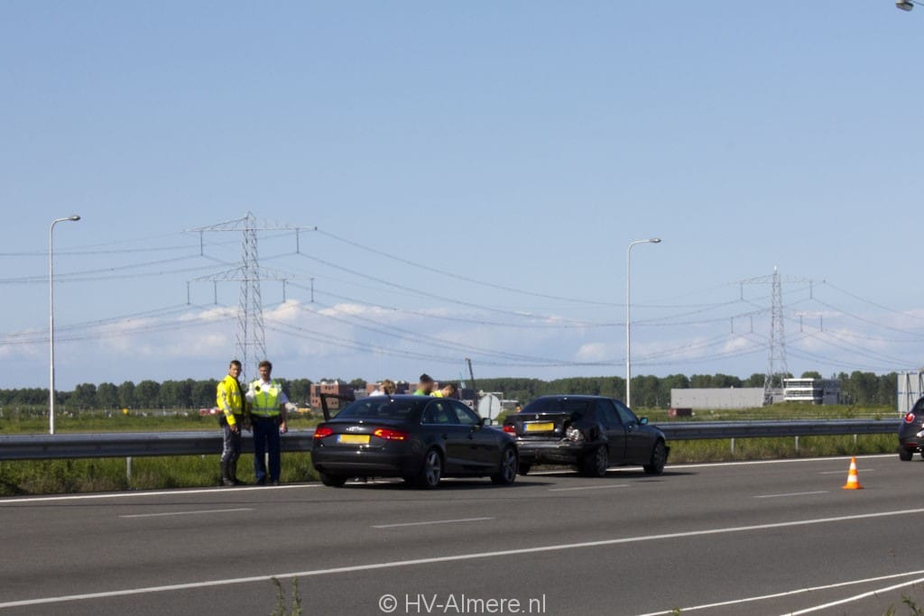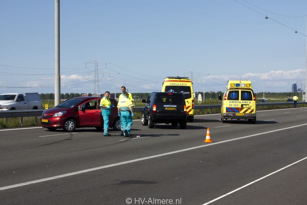 Donderdag middag vond er in de avondpits een kop-staart aanrijding plaats tussen een drietal personenwagens. Door de situatie die hierbij ontstond kwamen vier andereen kriskras op de snelweg tot stilstand. De hulpdientsen kregen de melding dat er zeven auto`s bij de aanrijding betrokken waren en dat er mogelijk iemand bekneld zat in het voertuig. Ook werd een traumahelikopter opgeroepen. Eenmaal ter plaatse bleek het allemaal minder erg dan ingeschat en kon de brandweer snel weer retour. In totaal is één persoon licht gewond geraakt. Deze persoon is behandelt in de ambulance. Er zijn drie voertuigen weggesleept, waarna de weg weer kon worden vrijgegeven.
