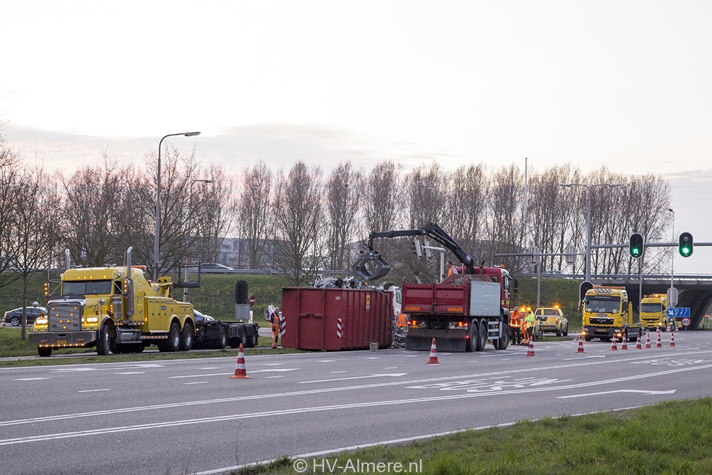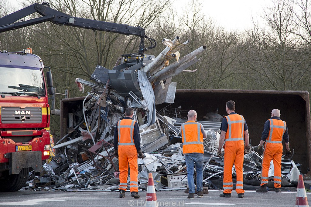 De aanhangwagen van de vrachtwagen kantelde in de bocht vanaf de A6 richting de Waterlandseweg. Hoewel de lading was afgedekt kon dit niet voorkomen dat het oude ijzer over meerdere rijstroken terecht kwam. De chauffeur kwam er zonder verwondingen vanaf.