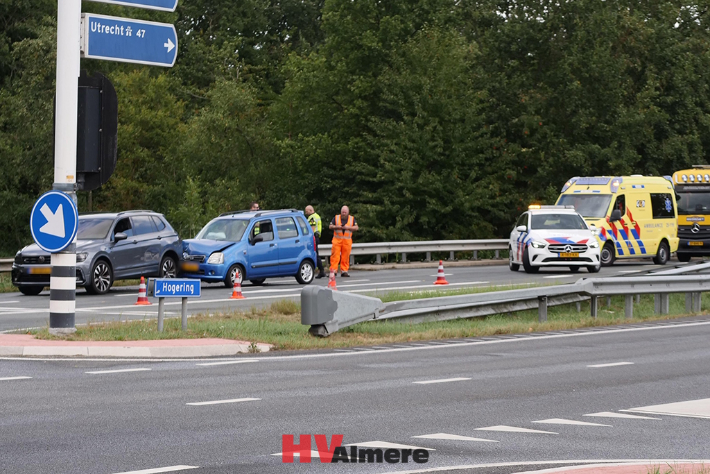 Rond 13:30 uur kwamen ter hoogte van de kruising met de Karperweg twee auto’s met elkaar in botsing. Een van de inzittenden is gecontroleerd in een ambulance. Door het ongeval was het verkeer op de Hogering tussen Almere Buiten en Almere Stad flink vastgelopen.