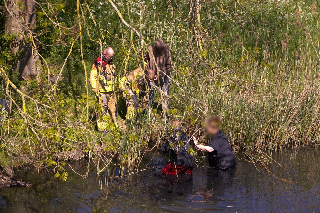 De eend herpakte zich en ging ervandoor. De meeuw zat echter volledig verstrikt in het visdraad. De inmiddels gearriveerde brandweer kon zich over de onfortuinlijke meeuw ontfermen. Maar nu moesten de twee bewoners nog het water uit zien te komen, wat toch nog een behoorlijke inspanning vergde. Ze zakten namelijk weg in de bodem en een van de redders moest met behulp van de brandweerlieden uit het water worden getrokken.
